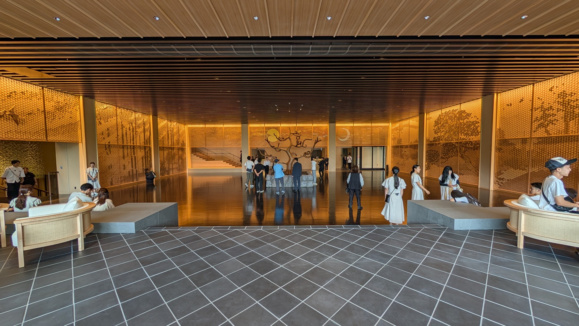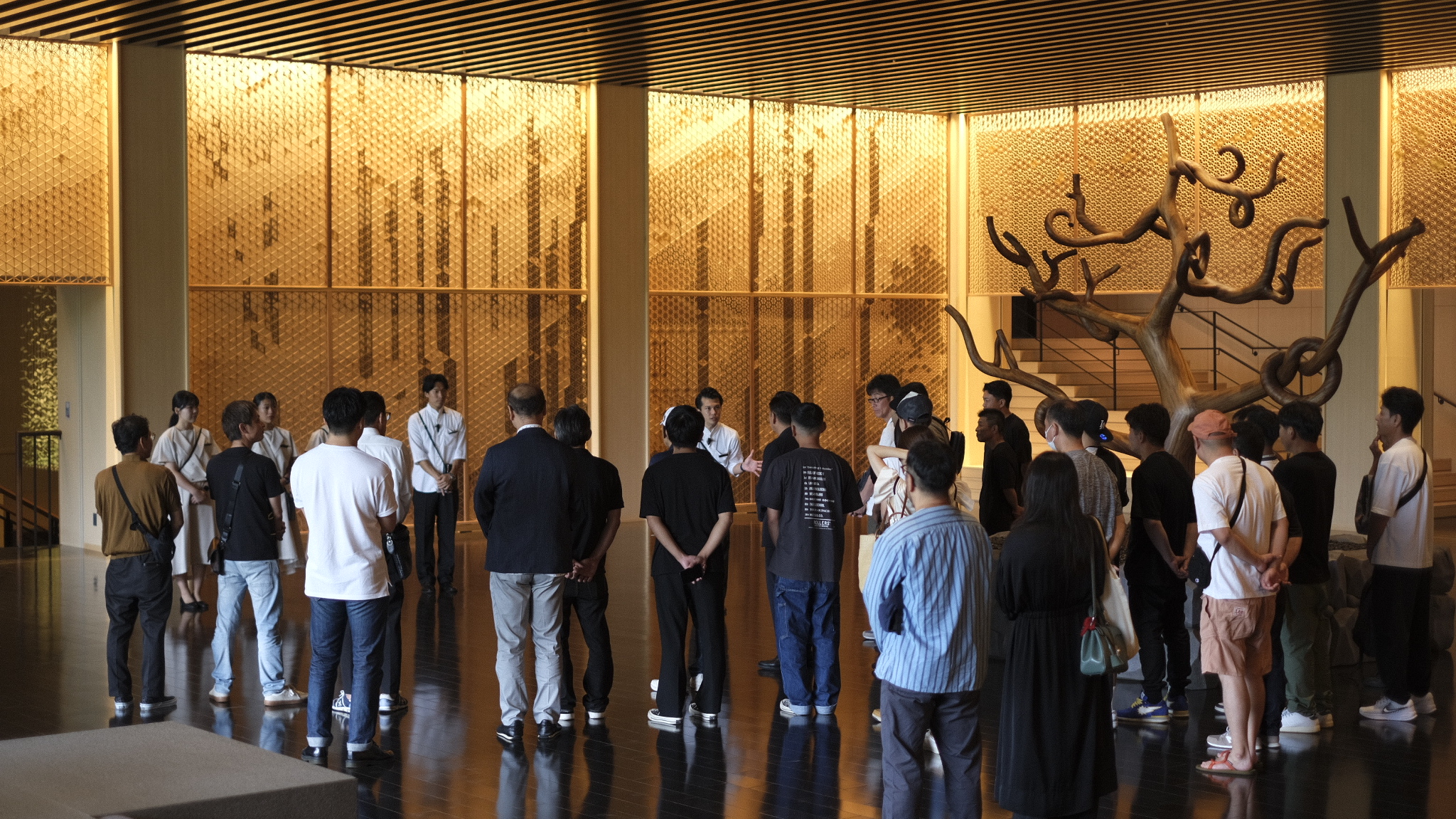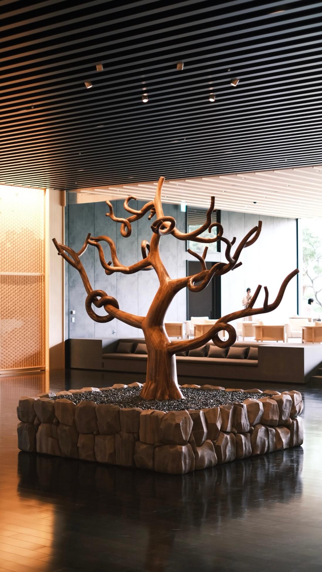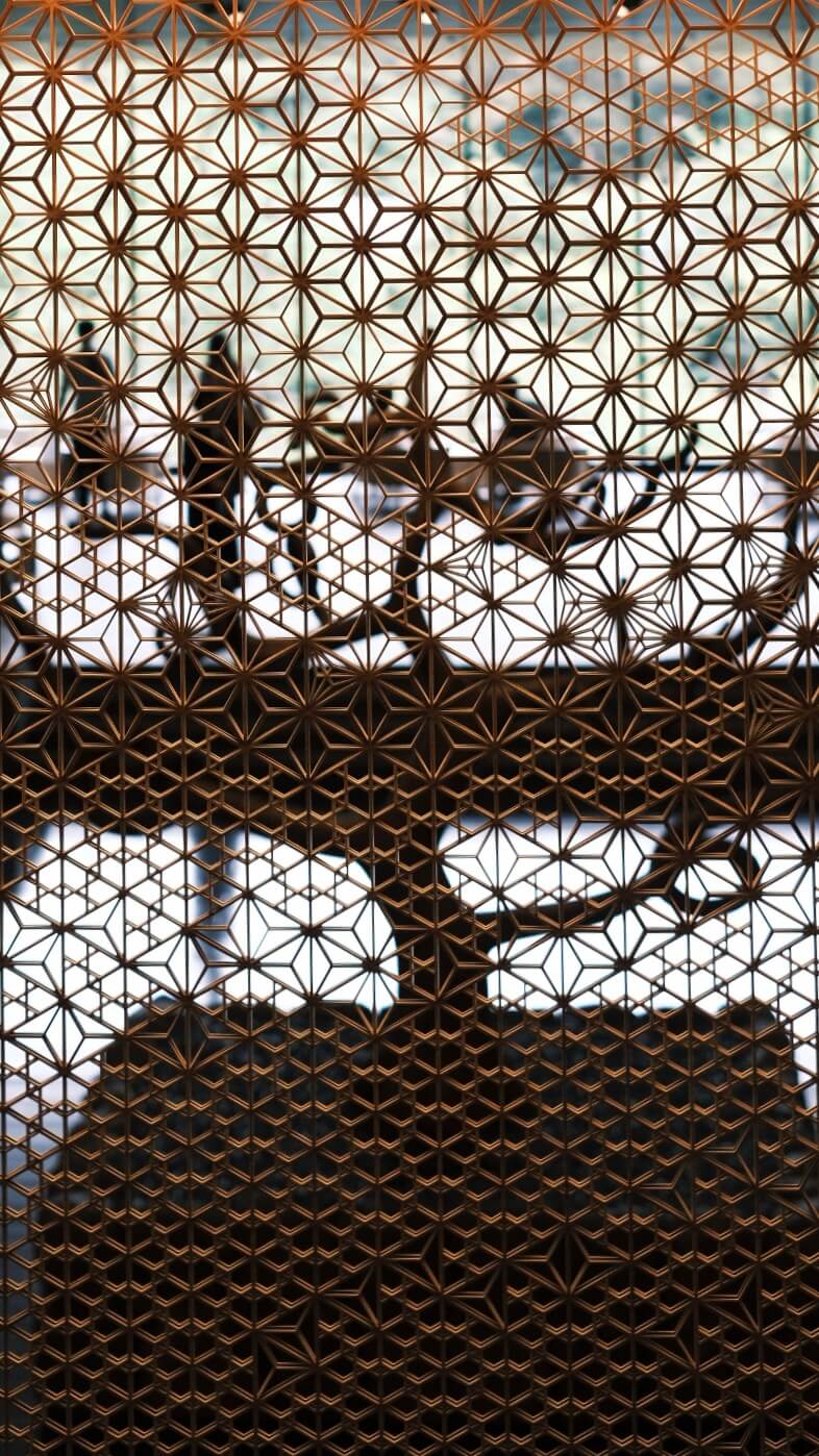 当社は大川市の職人、木下木芸さんや工房西田さんと協力しながら、メインロビー壁一面の組子、中央のオブジェ、剣具の技術を使った外壁ルーバーパネル、回路パネル、チェア、テーブル、ソファなどの家具を幅広く担当させていただきました。