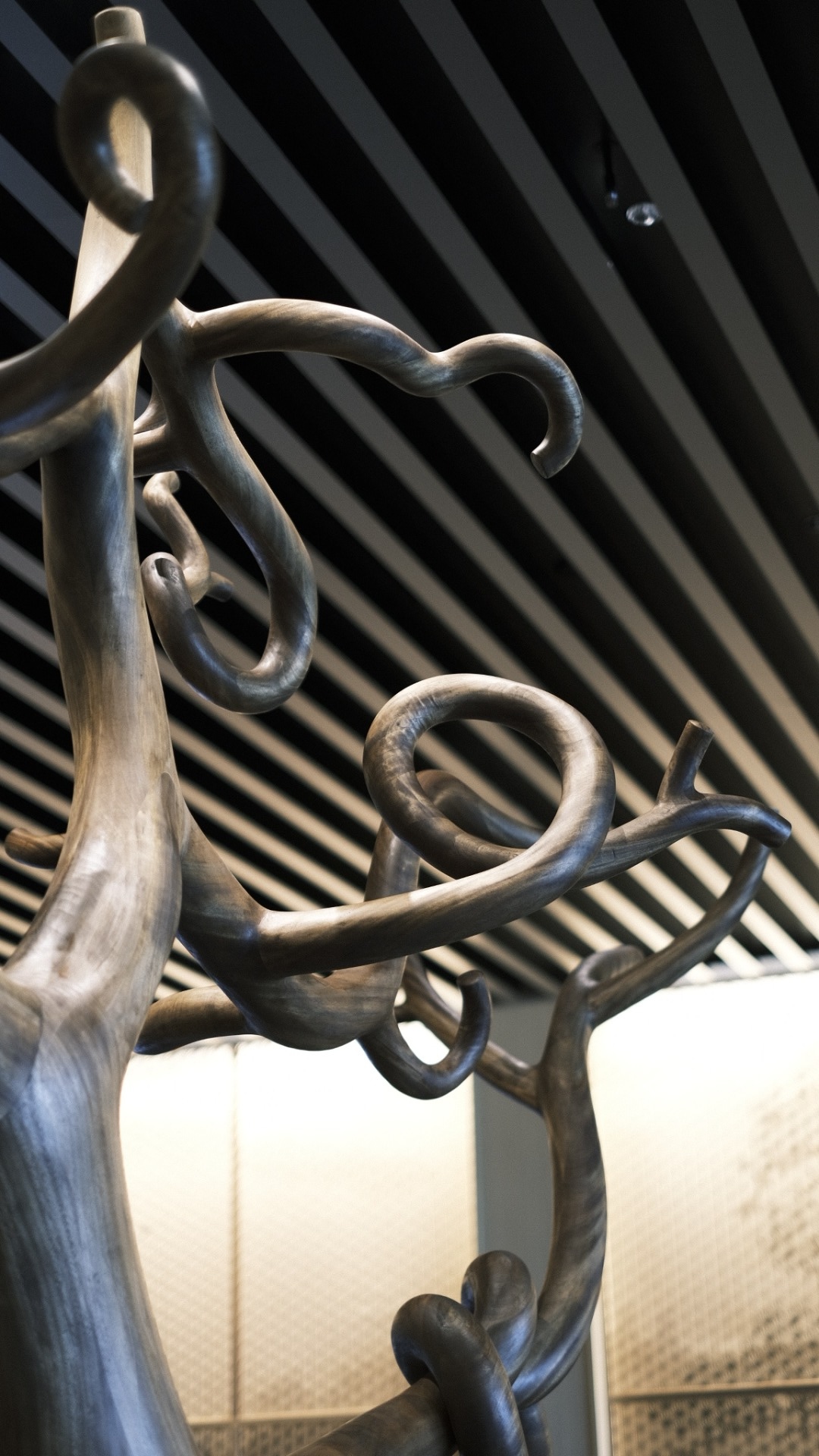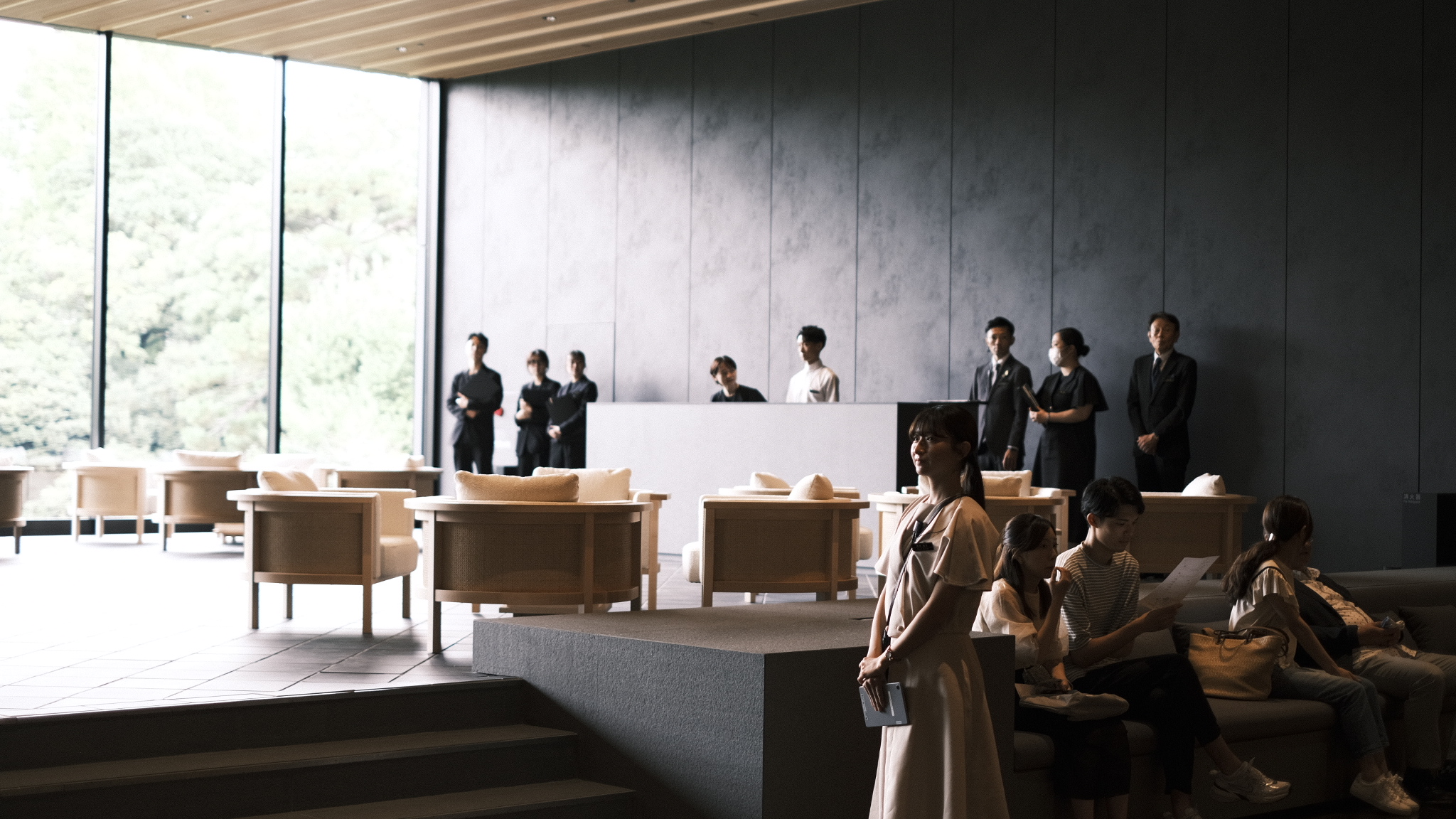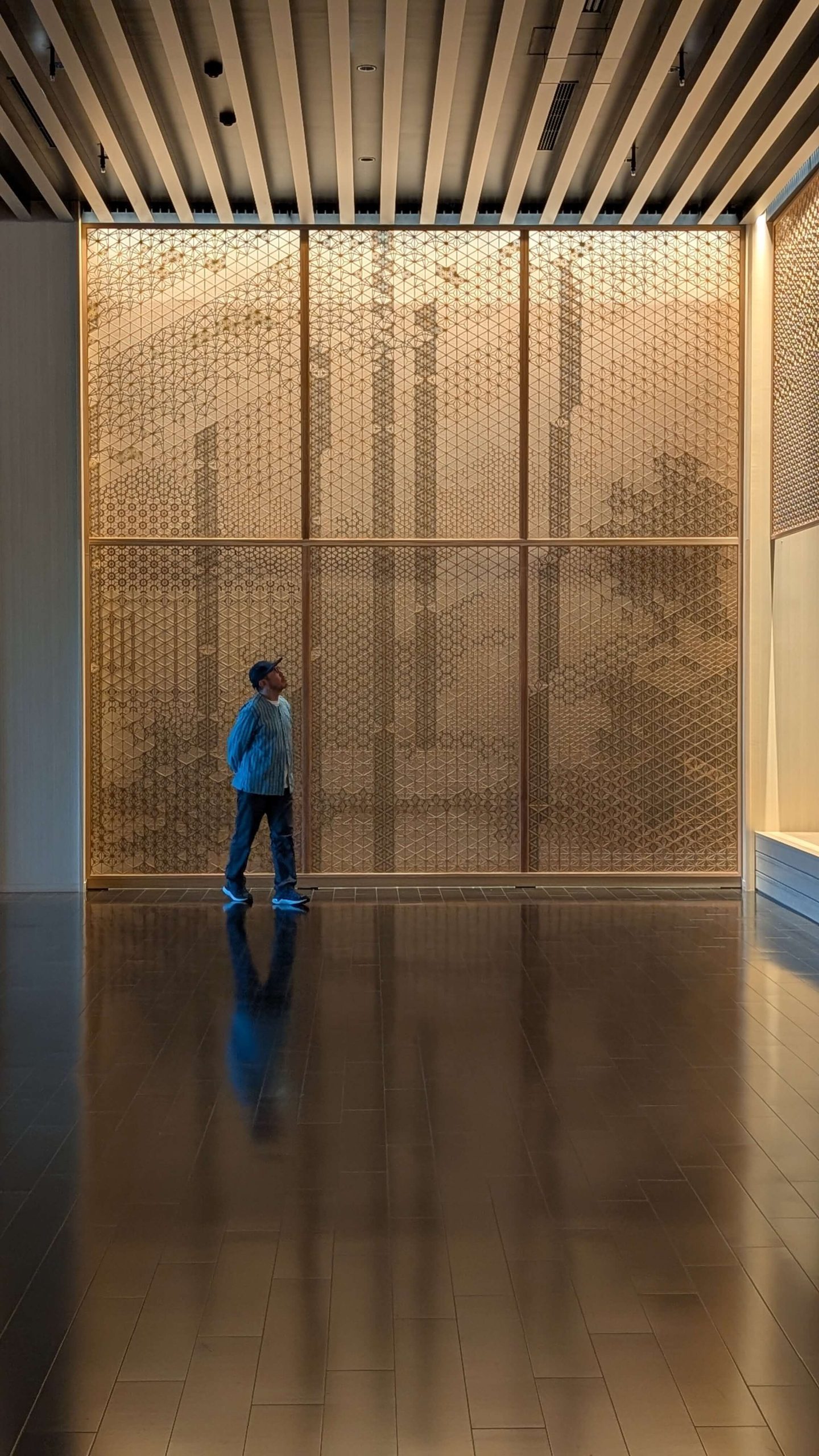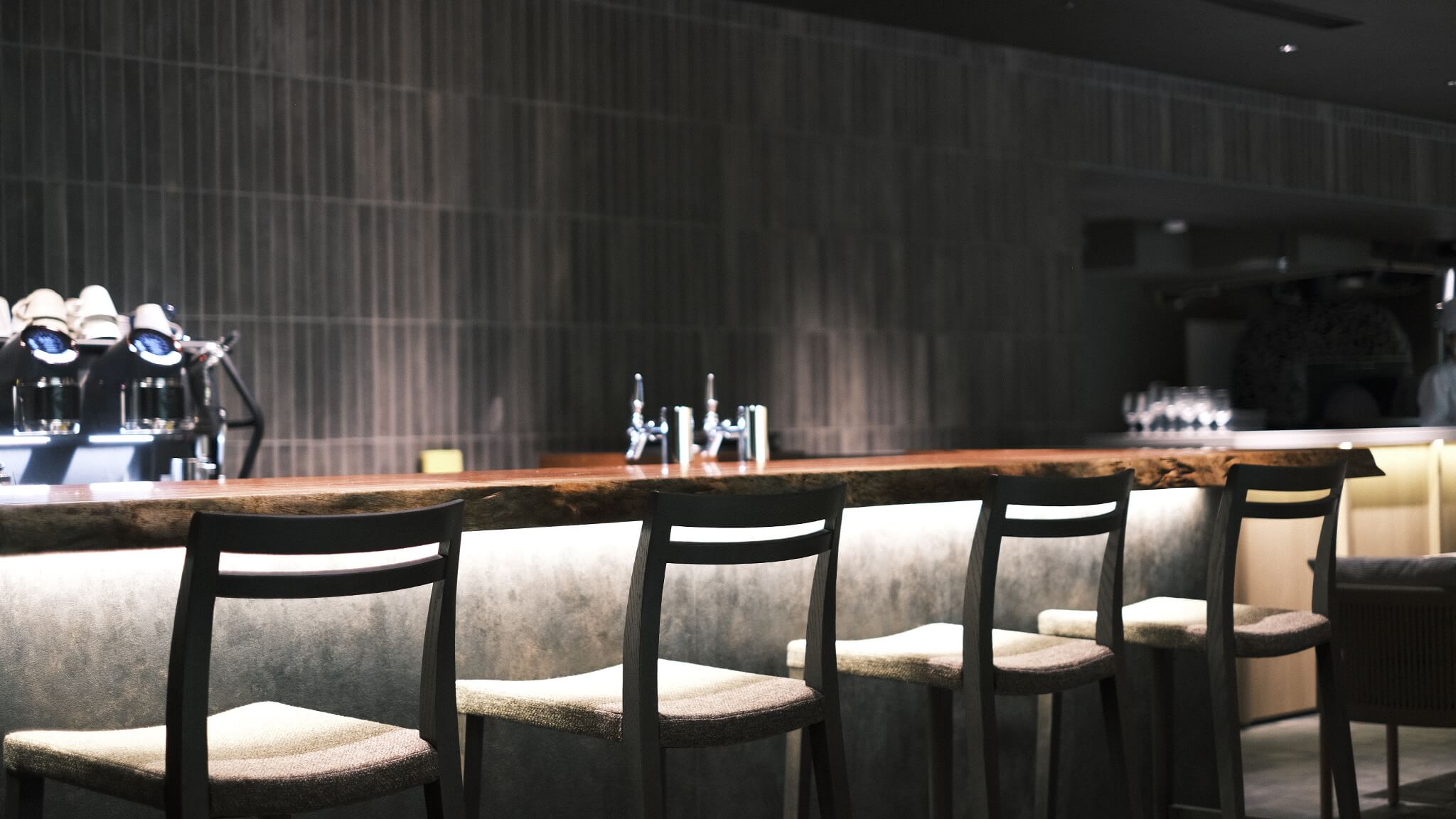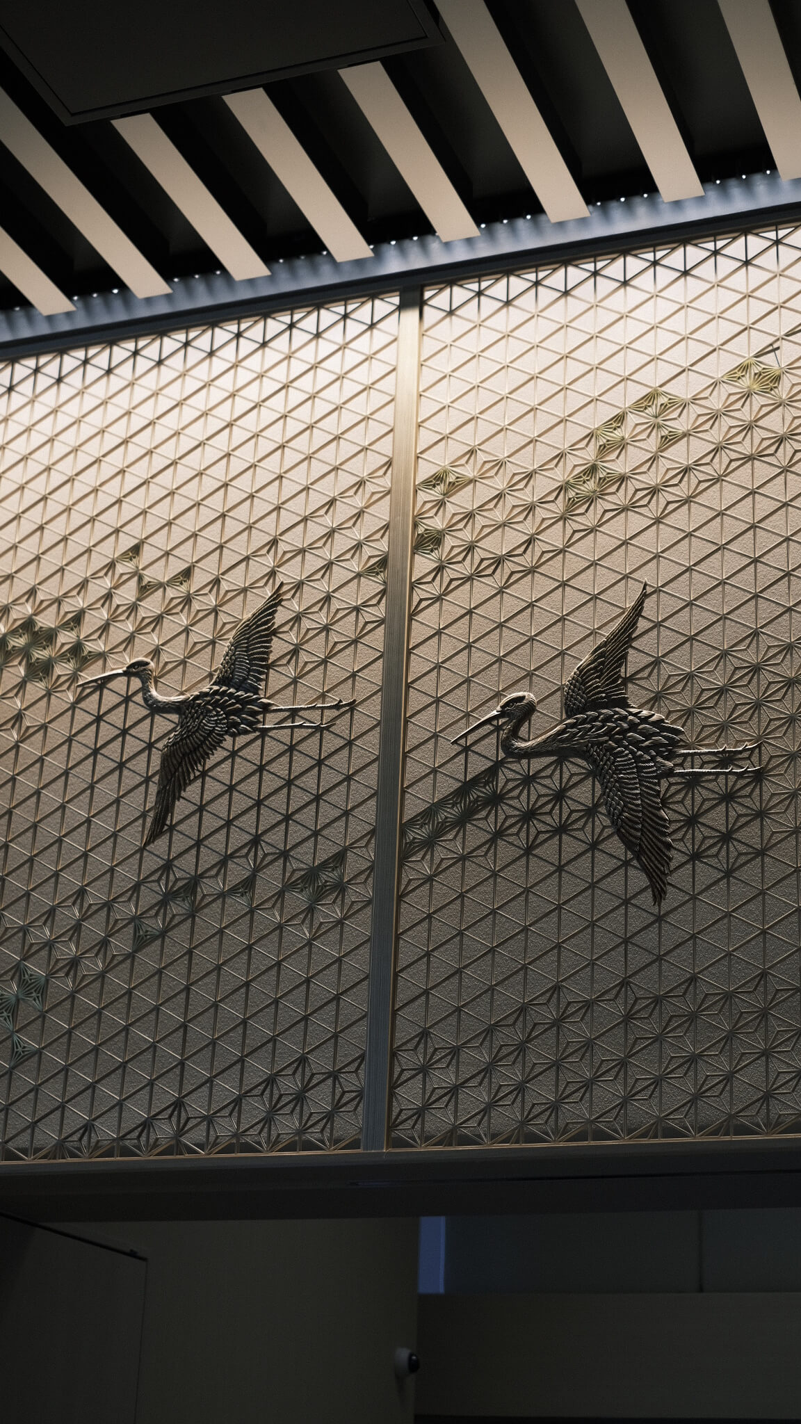 当社は大川市の職人、木下木芸さんや工房西田さんと協力しながら、メインロビー壁一面の組子、中央のオブジェ、剣具の技術を使った外壁ルーバーパネル、回路パネル、チェア、テーブル、ソファなどの家具を幅広く担当させていただきました。