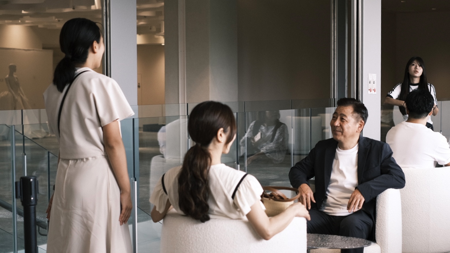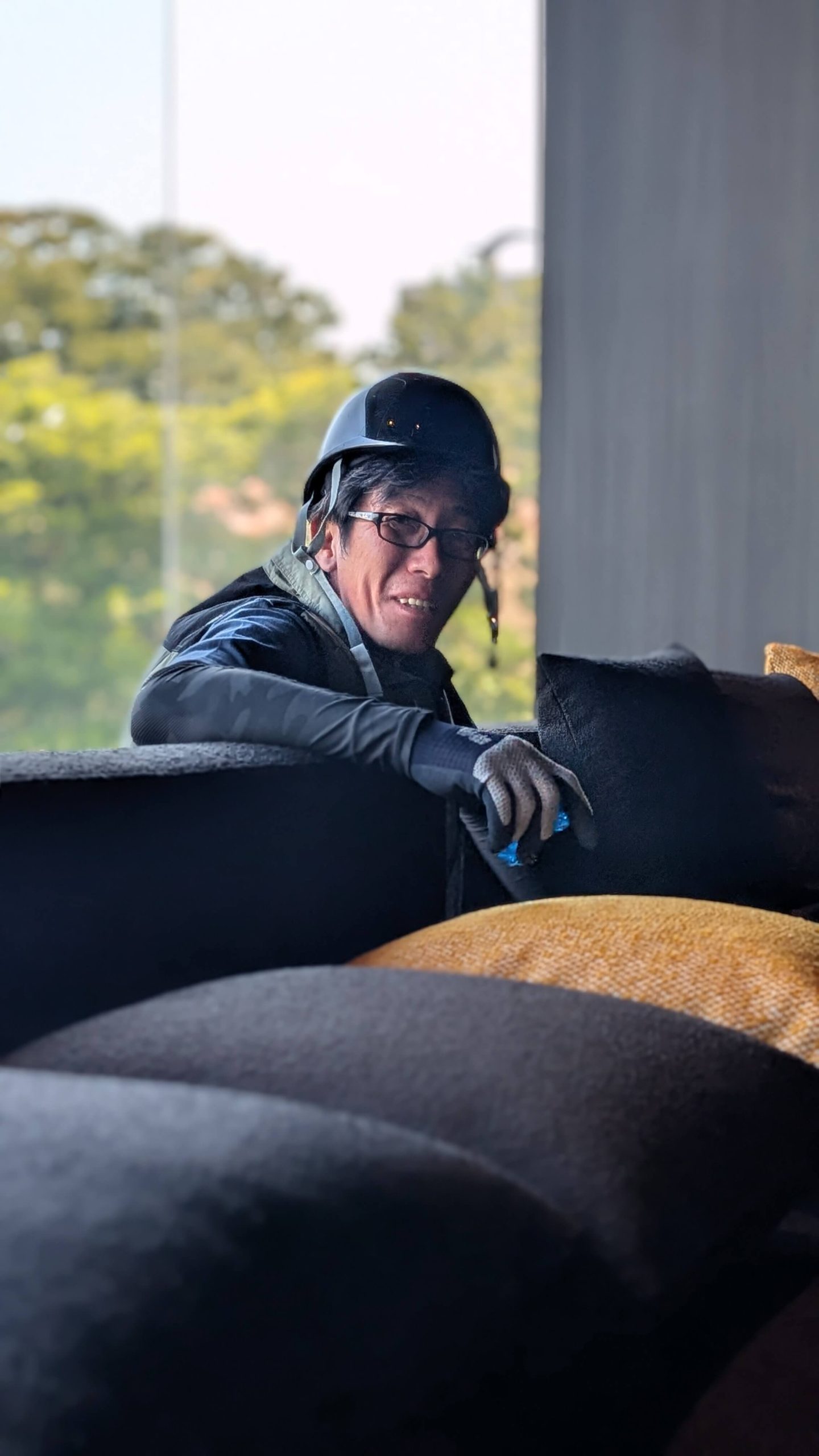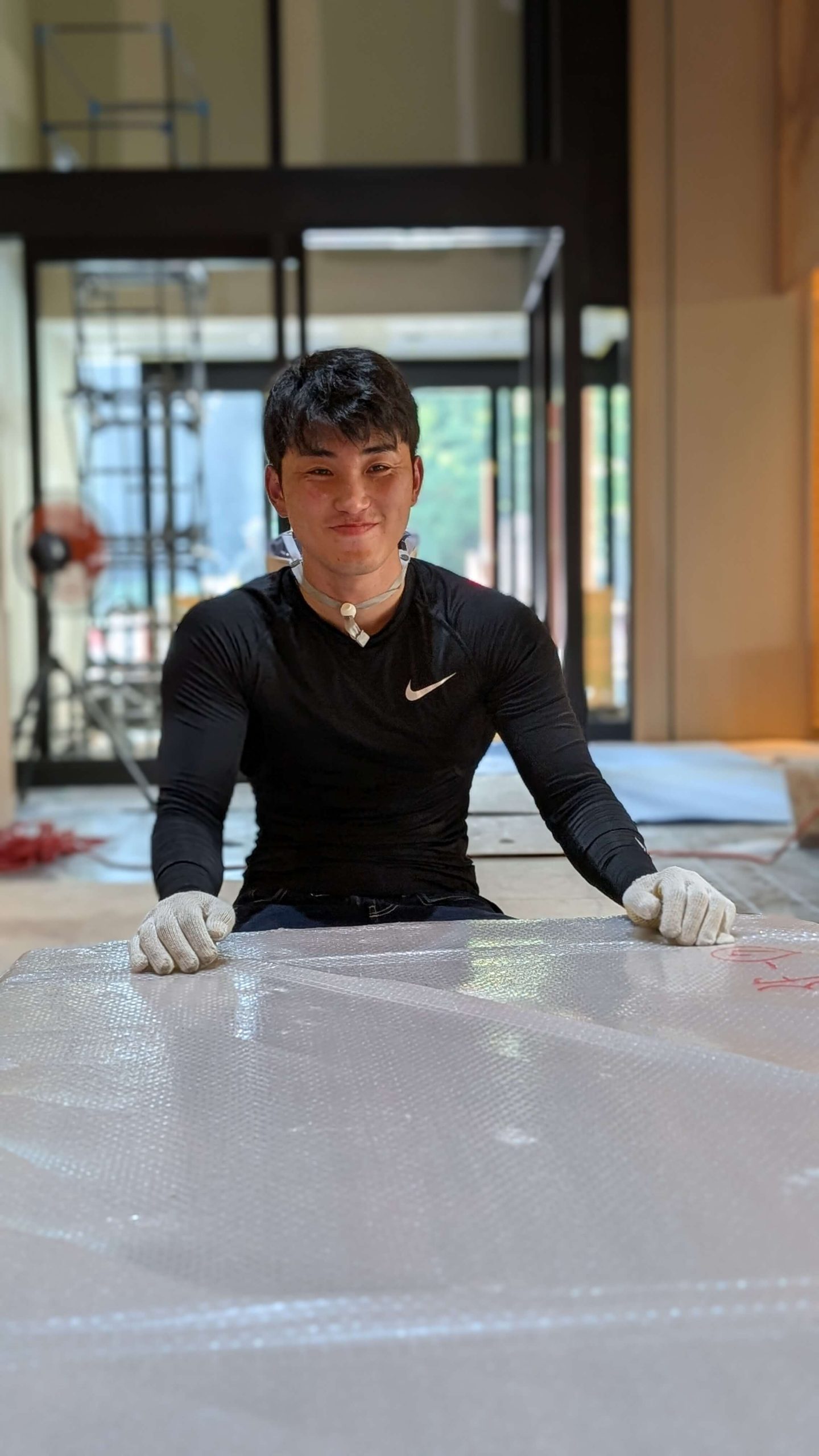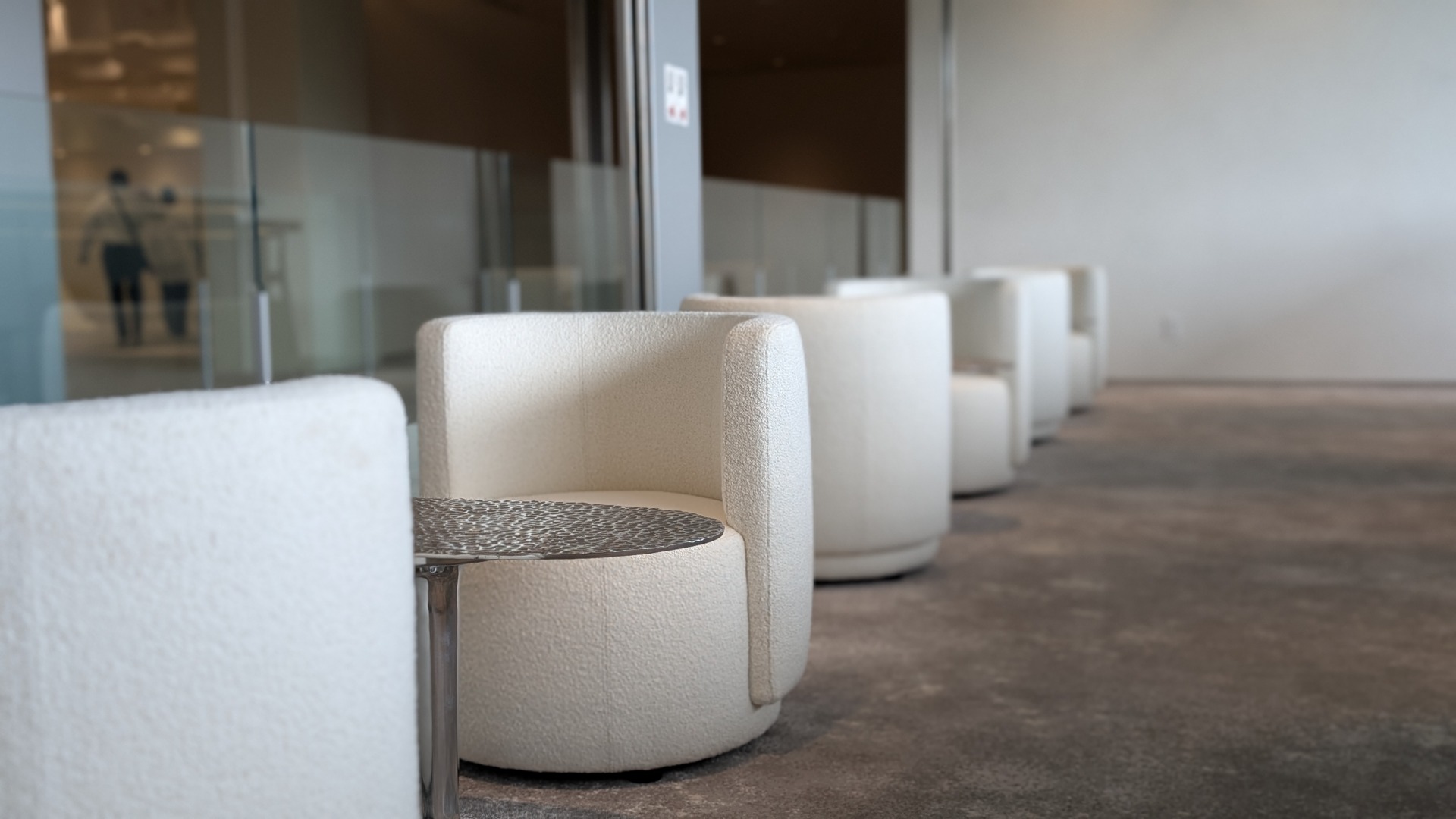 当社は大川市の職人、木下木芸さんや工房西田さんと協力しながら、メインロビー壁一面の組子、中央のオブジェ、剣具の技術を使った外壁ルーバーパネル、回路パネル、チェア、テーブル、ソファなどの家具を幅広く担当させていただきました。